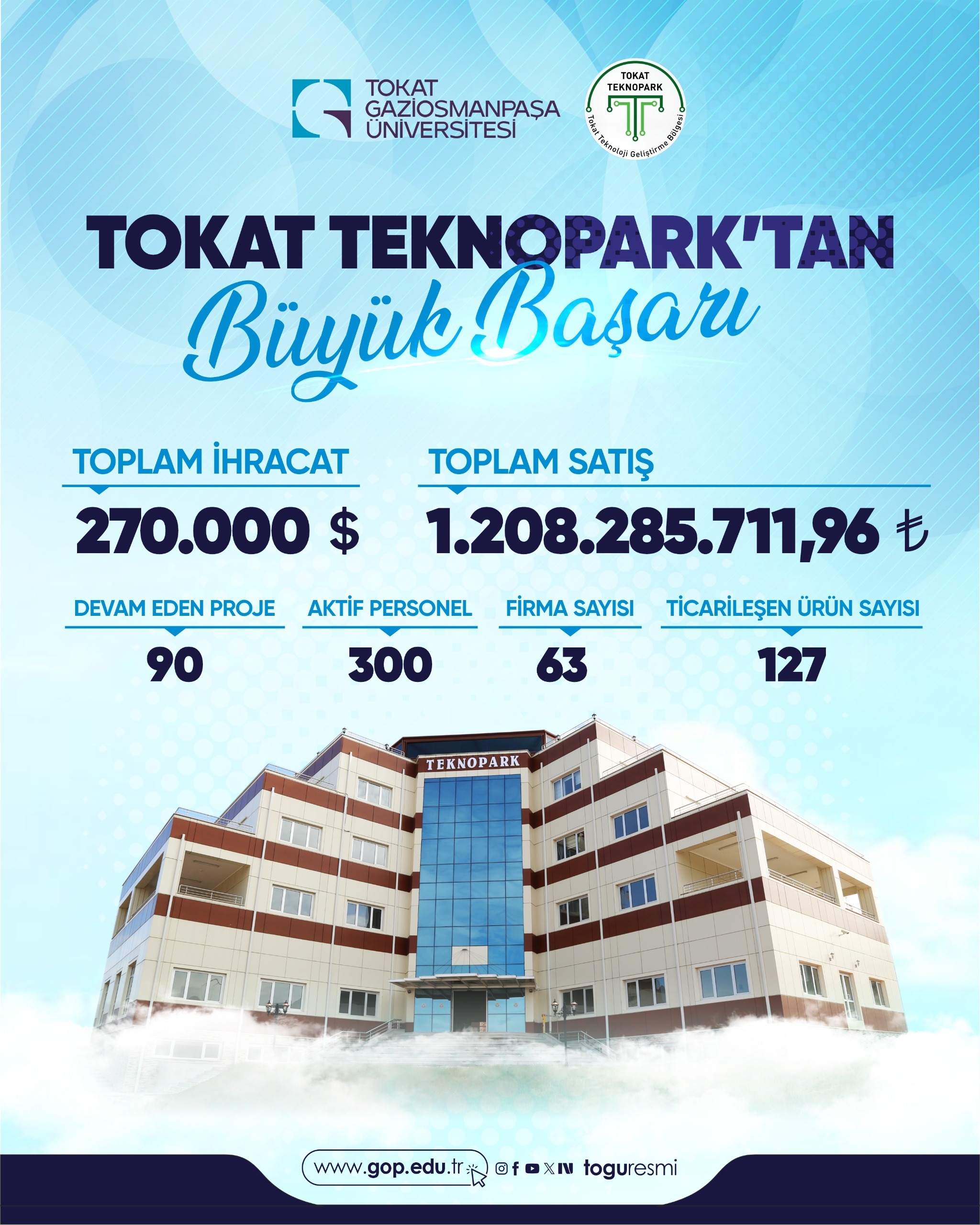 Üniversitemiz bünyesinde faaliyet gösteren Tokat Teknopark, ortaya koyduğu ekonomik ve teknolojik performansla dikkat çekiyor. Açıklanan güncel veriler, teknoparkın bölgesel kalkınmaya ve ulusal ekonomiye sağladığı katkının her geçen gün arttığını gösteriyor.