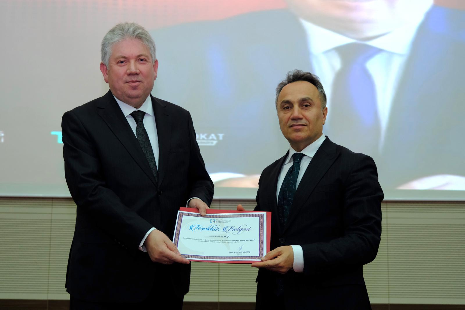 Söyleşi sonrasında Cumhurbaşkanlığı Eğitim Politikaları Kurulu Üyesi Ahmet Akça, Rektörümüz Prof. Dr. Fatih Yılmaz’ı makamında ziyaret etti.