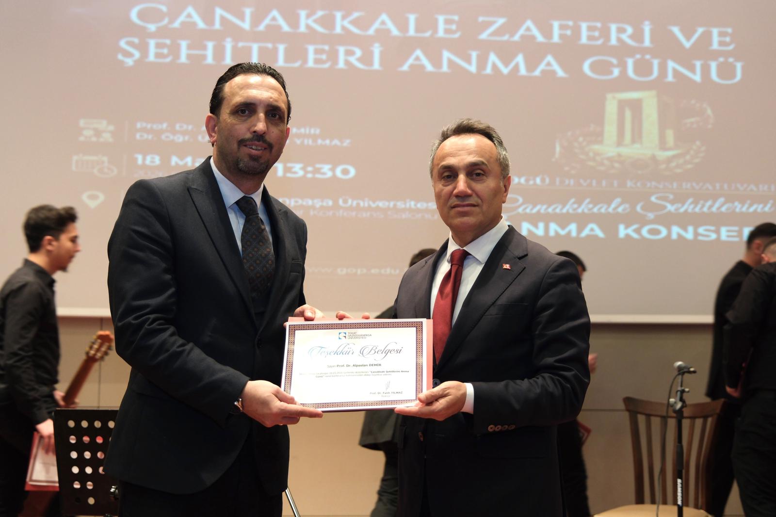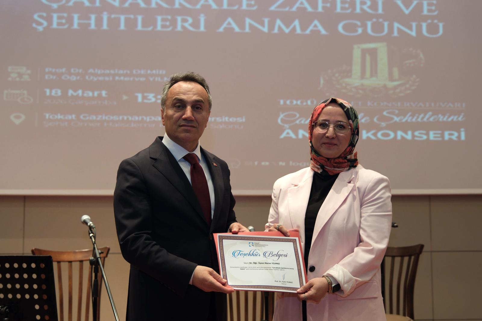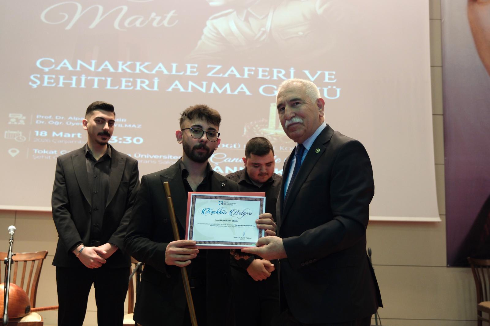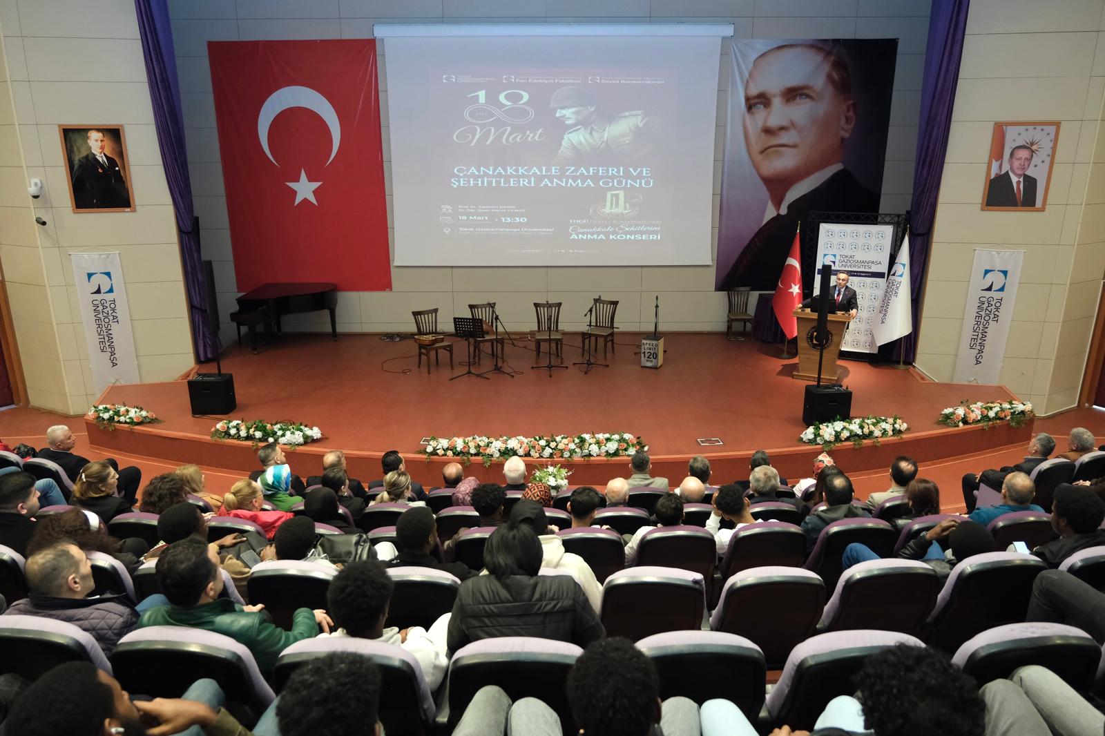 Üniversitemiz Fen-Edebiyat Fakültesi ile Devlet Konservatuvarı iş birliğinde düzenlenen “18 Mart Çanakkale Zaferi ve Şehitleri Anma Günü” programı, duygu dolu anlara sahne oldu. Şehit Ömer Halisdemir Konferans Salonu’nda gerçekleştirilen etkinliğe Tokat Milletvekili Kadim Durmaz, Rektörümüz Prof. Dr. Fatih Yılmaz, Rektör Yardımcımız Prof. Dr. Yusuf Temür, Rektör Danışmanları, dekanlar, müdürler, akademisyenler ve öğrenciler katıldı.