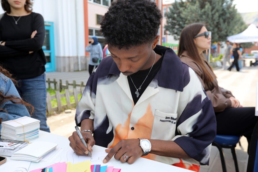Fakülte dersliklerinden Merkezi Yemekhane önüne ve Sanat Galerisi’ne kadar geniş bir alanda eş zamanlı olarak yürütülen etkinlikler, kampüste canlı bir sanat koridoru oluşturdu. Katılımcılar hem uygulamalı atölyelere dahil olma hem de profesyonel üretimleri yerinde inceleme fırsatı bularak tasarımın birleştirici gücünü deneyimledi.