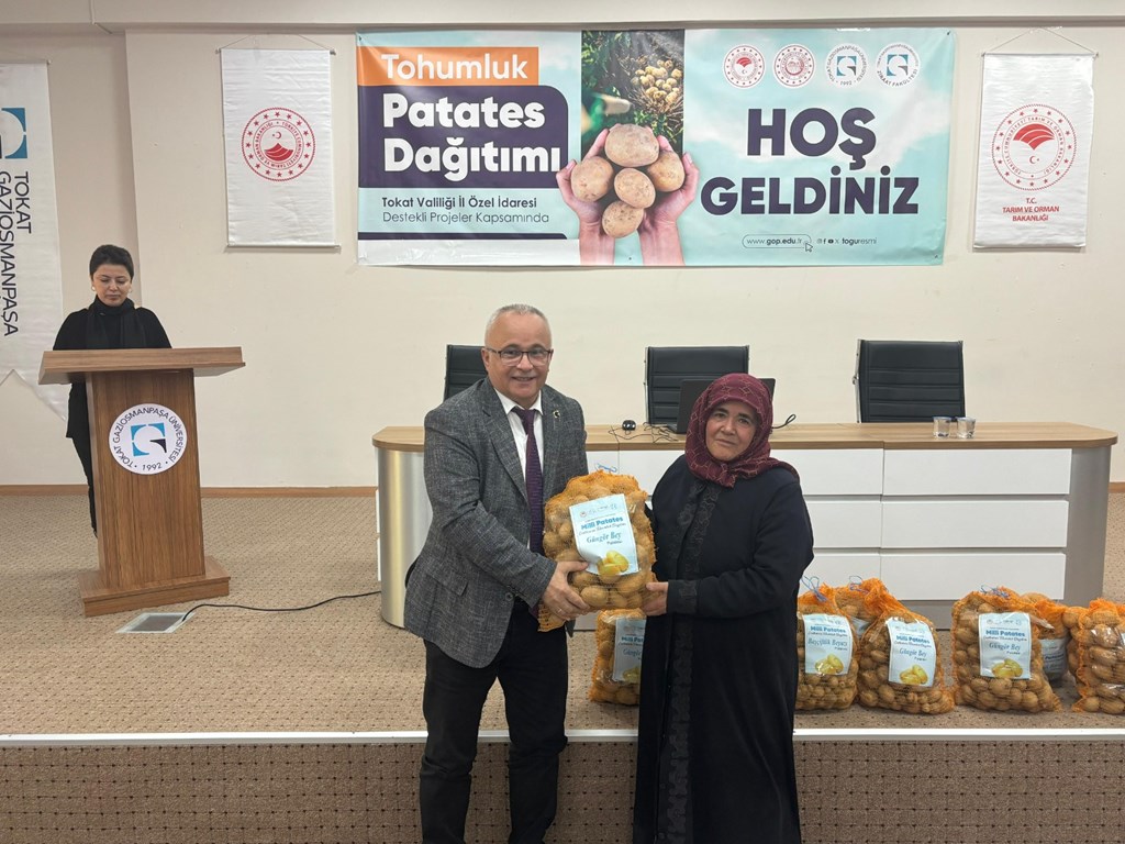 Proje yürütücüsü Doç. Dr. Yasin Bedrettin Karan yapmış olduğu konuşmada “Patateste Tokat Yöresine Yönelik Yeni Çeşit Geliştirme Çalışmaları ve Milli Çeşitlerin Tohumluk Üretim Sisteminin Oluşturulması” isimli proje hakkında bilgi verdi. Karan, patatesin anavatanı ve tarihçesinden bahsederek patatesin insan sağlığı için önemine değindi. Patates yetiştiriciliğinde tohumluk üretiminin önemine değinen Karan dağıtılan temel kademe tohumluk patateslerin fakültede kendileri tarafından geliştirilen milli ve yerli çeşit olduğunu ifade etti. Karan, projenin desteklenmesine katkı sağlayanlara teşekkürlerini ileterek konuşmasını sonlandırdı.