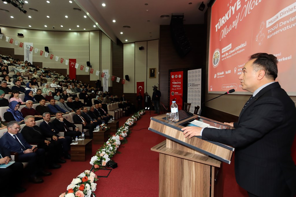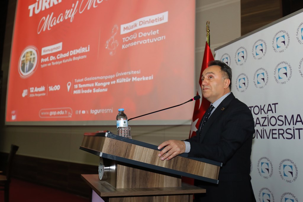 Açılış konuşmasının ardından, üniversitemiz Devlet Konservatuvarı tarafından müzik dinletisi gerçekleştirildi. Müzik dinletisinin ardından MEB Talim ve Terbiye Kurulu Başkanı Prof. Dr. Cihad Demirli, Türkiye Yüzyılı Maarif Modeli hakkında kapsamlı bir sunum yaptı. Prof. Dr. Demirli, bu modelin eğitim sistemimizin fiziki ve teknolojik altyapısının geliştirilmesi, insan kaynağının güçlendirilmesi ve eğitimin niteliğinin artırılması gibi temel hedefleri içerdiğini belirtti. Modelin temel amacının, yetkin ve erdemli bireyler yetiştirmek olduğunu vurguladı. Prof. Dr. Demirli, Türkiye Yüzyılı Maarif Modeli’nin, 2004 yılında yapılandırmacı eğitim yaklaşımındaki büyük dönüşüme benzer bir paradigma değişikliği sunduğunu ifade etti. Modelin, öğrencilere 21. yüzyıl becerileri kazandırmayı, eleştirel düşünme ve sorgulama yeteneklerini geliştirmeyi amaçladığını; ayrıca milli ve manevi değerlerle donatılmış bireyler yetiştirme fırsatı sunduğunu belirtti. Konferansta, eğitimde öğrenci merkezli bir ortamın önemine değinen Prof. Dr. Demirli, okulların yalnızca bilgiye erişim değil, aynı zamanda bilginin üretimiyle de ön plana çıkması gerektiğini söyledi. Eğitimde merak duygusunu harekete geçiren ve öğrencilerin aktif katılımını sağlayan yöntemlerin benimsenmesi gerektiğini vurguladı. Konferans soru ve cevaplarla devam etti. Konferansın soru cevap kısmında Rektörümüz Prof. Dr. Fatih Yılmaz, üniversitemizin tüm laboratuvarlarının Tokat Milli Eğitim bünyesindeki okulların kullanımına açık olduğunu ifade etti.
