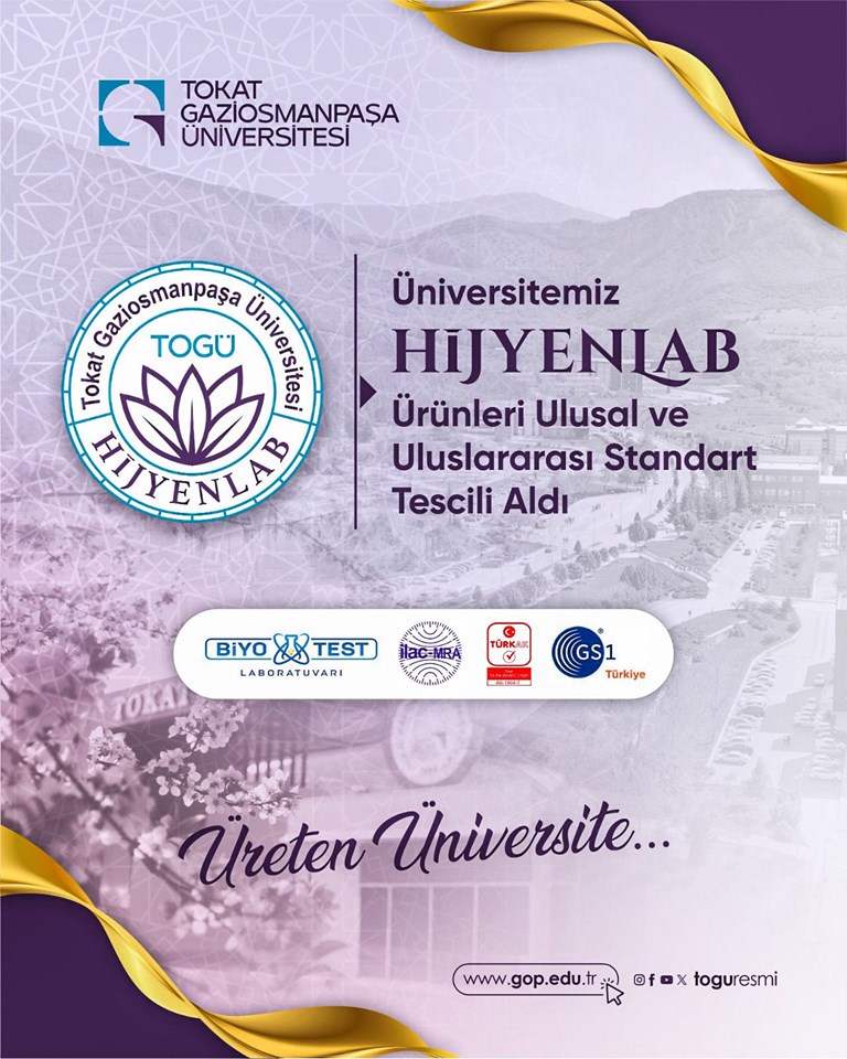 Üniversitemiz HijyenLab markasıyla ürettiğimiz ürünlerin kalitesi ve güvenilirliği ulusal ve uluslararası standartlarla tescillendi. Ürünlerimiz, hem GS1 Türkiye tarafından tescillendi hem de akredite laboratuvarlarda yapılan analizlerle onaylandı.