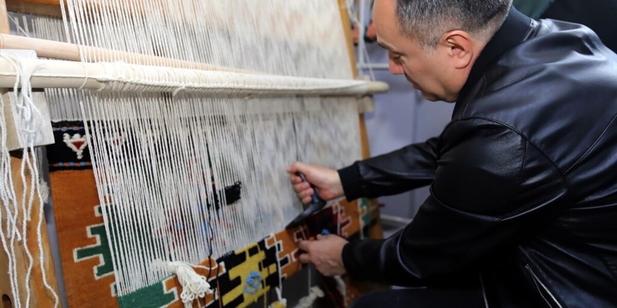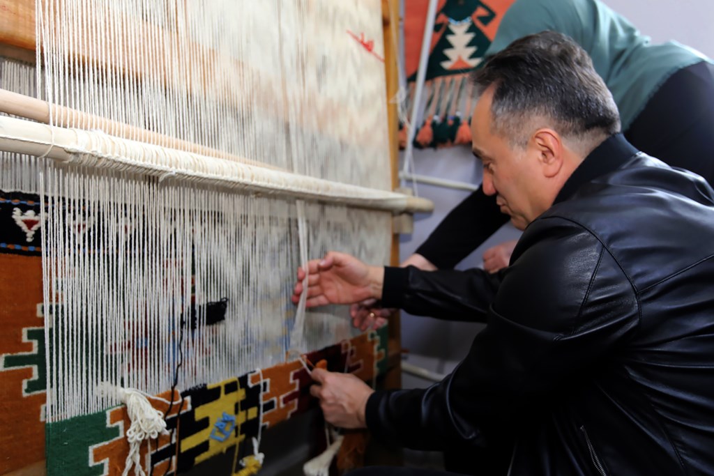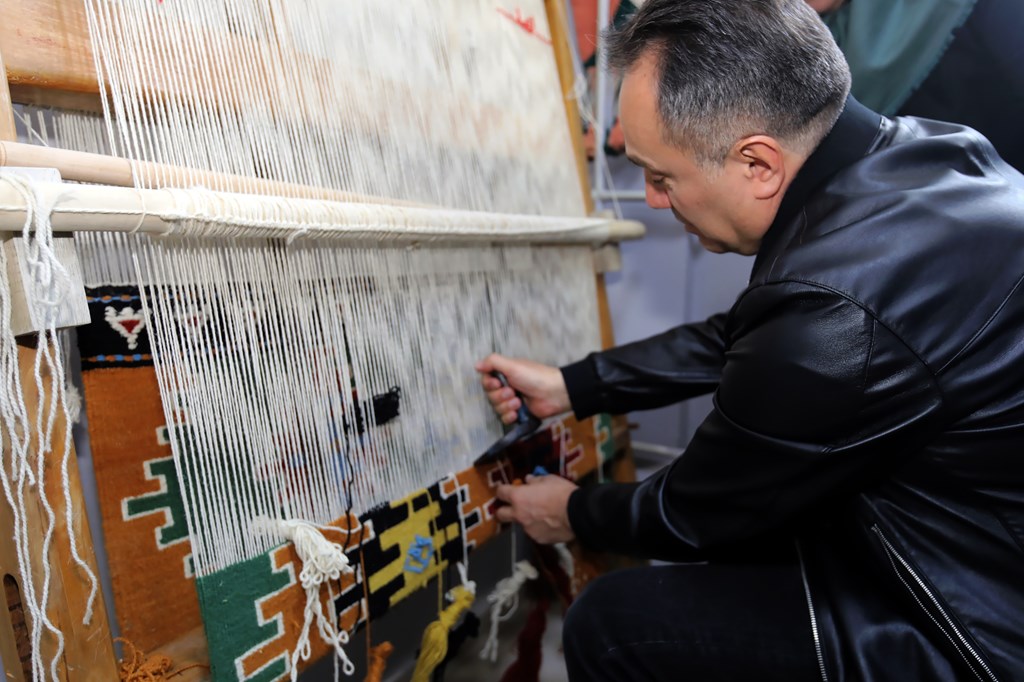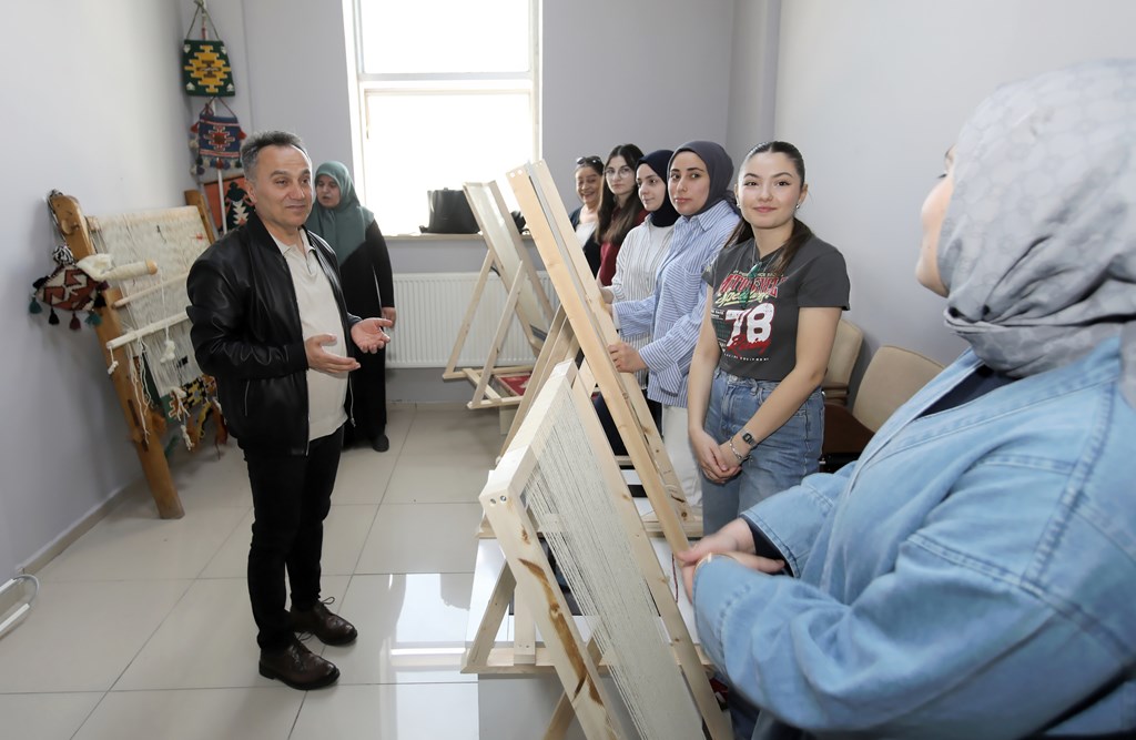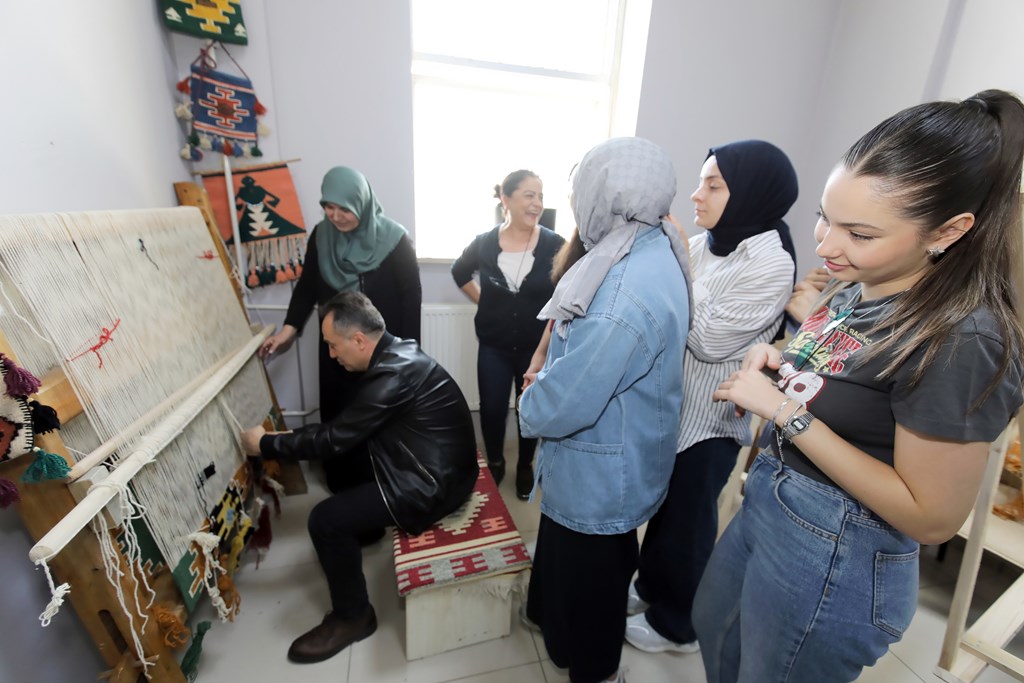 Kursiyerlerle birebir sohbet eden Rektörümüz onların deneyimlerini dinleyerek kursların katkılarını değerlendirdi. Kızık Kilim Dokuma tezgahına geçerek kilim dokuma deneyimi yaşayan Yılmaz, geleneksel el sanatlarına olan ilgisini gösterdi.