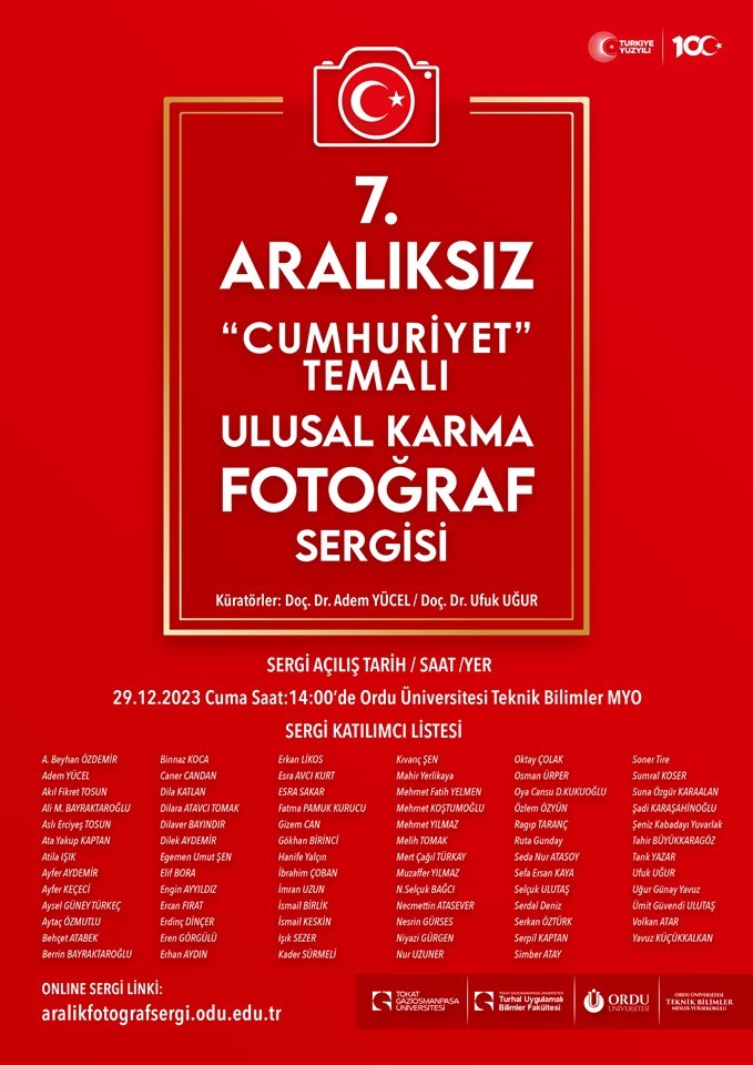 Tokat Gaziosmanpaşa Üniversitesi Turhal Uygulamalı Bilimler Fakültesi ve Ordu Üniversitesi Teknik Bilimler MYO iş birliği ile VII. Aralıksız “Cumhuriyet” Temalı Ulusal Karma Fotoğraf Sergisi düzenlendi Sergi 29 Aralık 2023 Cuma günü saat: 14:00’de Ordu Üniversitesi Teknik Bilimler MYO sergi fuaye alanında basılı olarak ve aynı zamanda “aralikfotografsergi.odu.edu.tr” adresinden online galeride erişime açıldı.