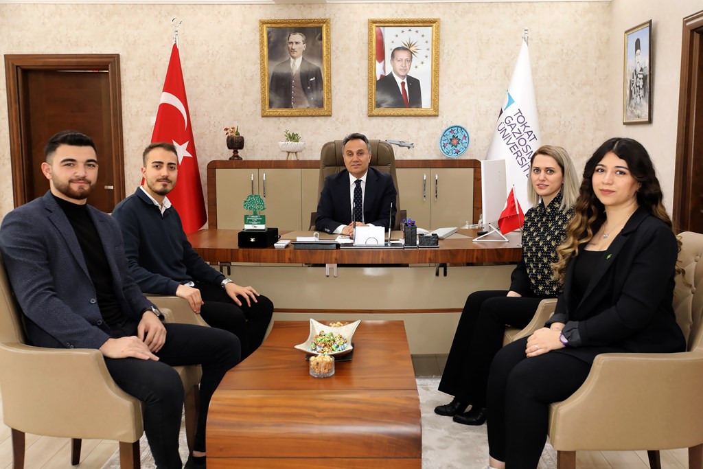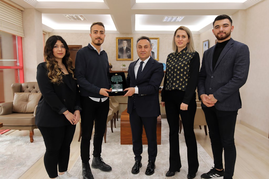 TOGÜ TEMA Kulübü Danışmanı Dr. Ögr. Üyesi Esra Kaplan ve Kulüp başkanı Erdem Türköz Rektörümüz Prof. Dr. Fatih YILMAZ’ı makamında ziyaret etti. Ziyarette TOGÜ TEMA Kulübünün çalışmaları hakkında bilgiler veren Kulüp yönetimi, Türkiye genelinde en fazla gönüllü kazanımı kapsamında gönüllülük ödüllerinde birincilik ödülü aldıklarını belirtti. Rektörümüz Prof. Dr. Fatih YILMAZ, almış oldukları ödülden dolayı Kulüp Danışmanı Dr. Öğr. Üyesi Esra KAPLAN, Kulüp Başkanı Erdem TÜRKÖZ ve Kulüp Başkan yardımcıları Seyit Ömer KİRİŞ ve Sena Nur GÜLMEZ’i tebrik ederek başarılar diledi.