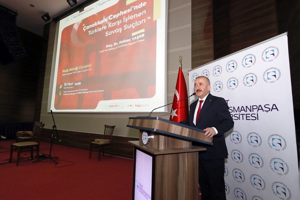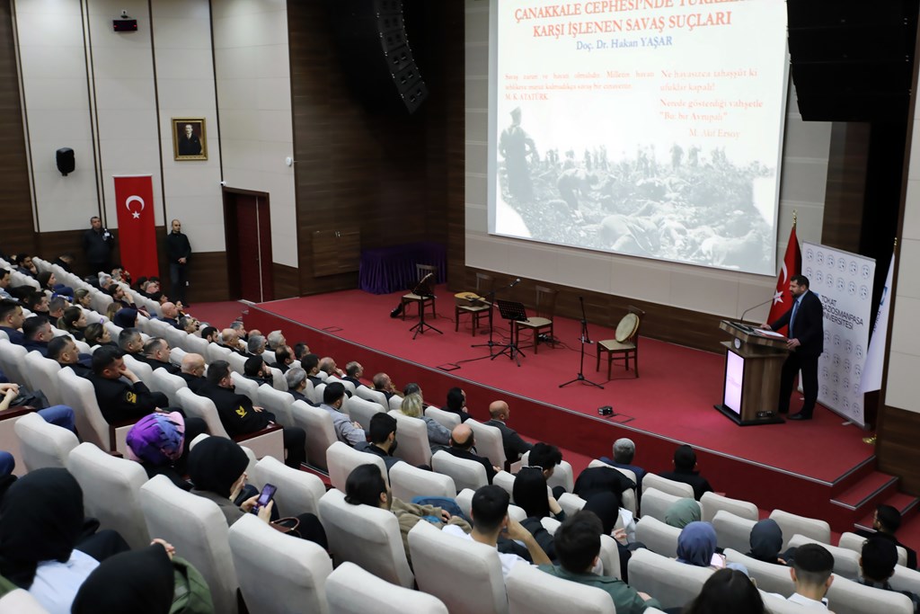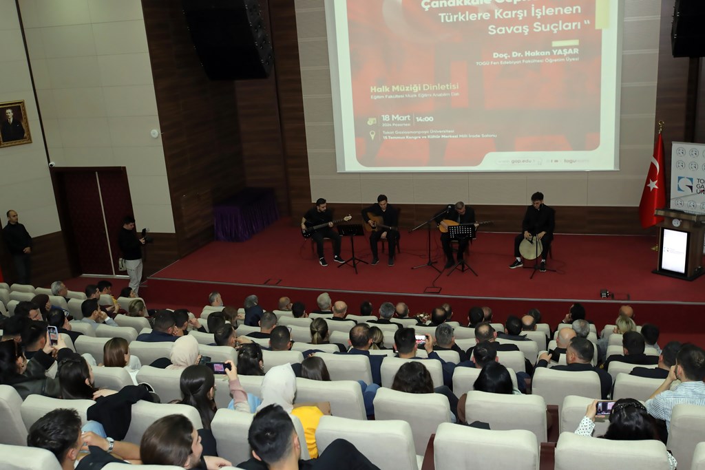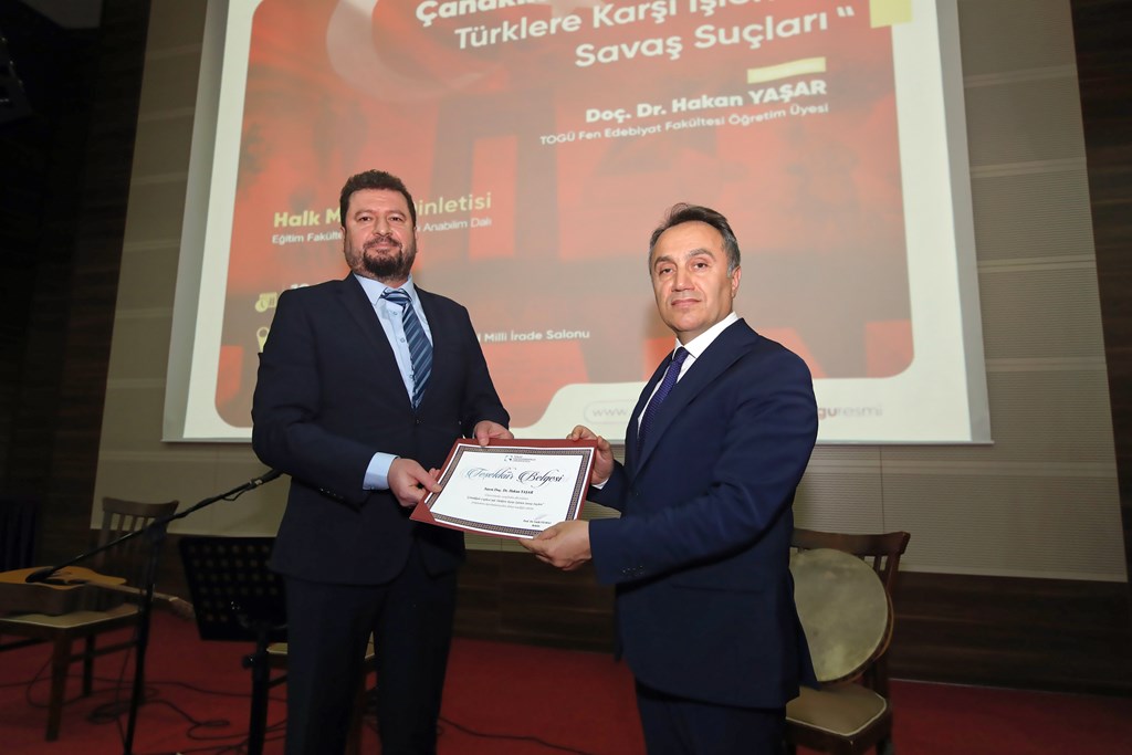 Akabinde Fen Edebiyat Fakültesi Öğretim Üyesi Doç. Dr. Hakan YAŞAR tarafından “Çanakkale Cephesi'nde Türklere Karşı İşlenen Savaş Suçları” adlı konferans gerçekleştirildi. YAŞAR konferansında Çanakkale Savaşı sürecinde yapılan insanlık ve savaş suçları konusunda detaylı bilgileri dinleyicilere aktardı. Konferans sonrasında Rektörümüz Prof. Dr. Fatih YILMAZ tarafından Doç. Dr. Hakan YAŞAR’a teşekkür belgesi takdimi yapıldı. Konferans sonrasında Üniversitemiz Eğitim Fakültesi tarafından düzenlenen Halk Müziği Dinletisi gerçekleştirildi.
