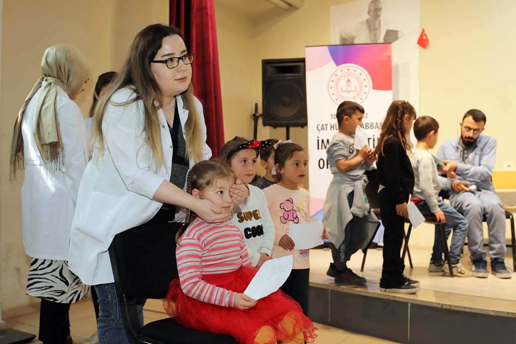Gerçekleştirilen etkinlikle ilgili açıklama yapan Üniversitemiz Tıp Fakültesi Aile Sağlığı Anabilim Dalı Öğretim Üyesi Dr. Öğr. Üyesi Elif ERDOĞDU CEYLAN, “Bugün Çat kasabası birinci sınıf öğrencilerinin sağlık taramalarını gerçekleştiriyoruz. Özellikle böyle dezavantajlı kurumlarda, merkezlerde öğrencilerin bazı sağlık durumları atlanabiliyor, gözden kaçabiliyor. Biz de bu amaçla göz, boy ve kilo kontrollerini yapıp obeziteye eğilimlerinin olup olmadığını araştırıyor ve ileride olası hastalıklara karşı ebeveynleri uyararak bir sağlık kurumu ile iletişime geçmelerini sağlıyoruz. Bugün Çat Kasabasına Aile Hekimliği Anabilim Dalından ve Göz Anabilim Dalından asistan arkadaşlarımızla birlikte geldik ve sağlık taramalarını gerçekleştiriyoruz. Bu konuda bize destek veren başta Rektörümüz Prof. Dr. Fatih YILMAZ olmak üzere, Aile Hekimliği Anabilim Dalı Başkanımız Doç. Dr. Nagehan YILDIZ ÇELTEK’e, emeği geçen tüm hocalarımıza ve asistan arkadaşlarımıza teşekkür ediyoruz” ifadelerini kullandı.
