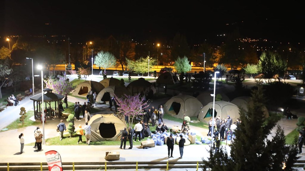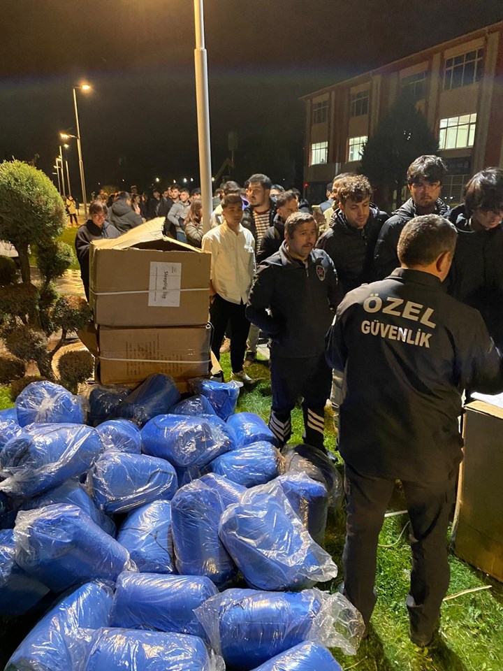 Yaşanan deprem sonrası büyük panik yaşayan öğrenciler için merkezi yemekhane önünde çadır kurulumu gerçekleştirildi. Yurtlarda kalmak istemeyen öğrenciler için hazırlanan çadırlar personelimizin katılımıyla kısa sürede kuruldu. Akabinde öğrencilere uyku tulumları dağıtıldı. Rektörümüz Prof. Dr. Fatih YILMAZ çalışmaları yerinde inceledi, öğrencilerle yakından ilgilendi.