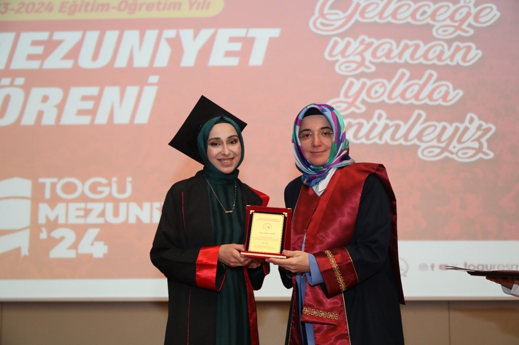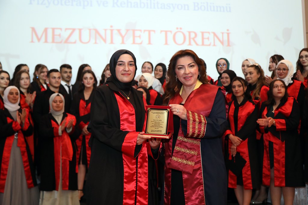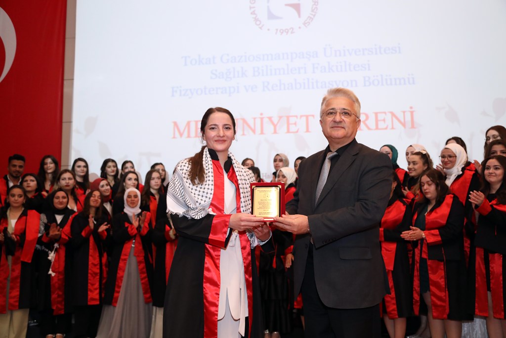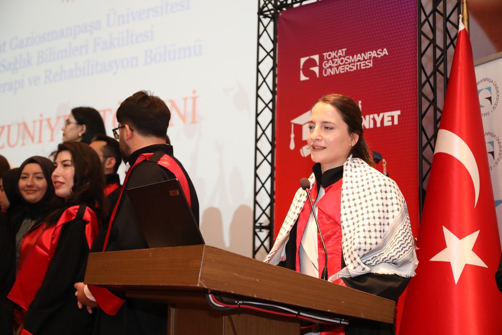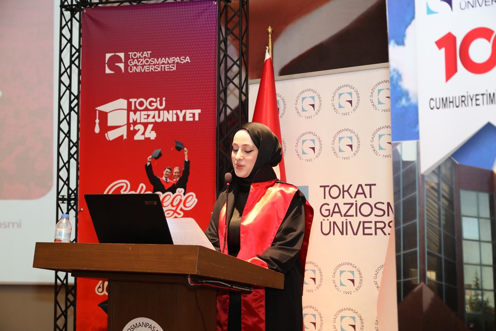 Sağlık Bilimleri Fakültesi Birincisi ve Üniversitemiz Lisans İkincisi Dilan TAŞAR yapmış olduğu konuşmada, hocalarına, ailesine ve arkadaşlarına teşekkür etti. Geleceğe umutla bakacağını ifade eden TAŞAR, çalışmanın ve topluma katkı sağlamanın önemine değinerek konuşmasını sonlandırdı.