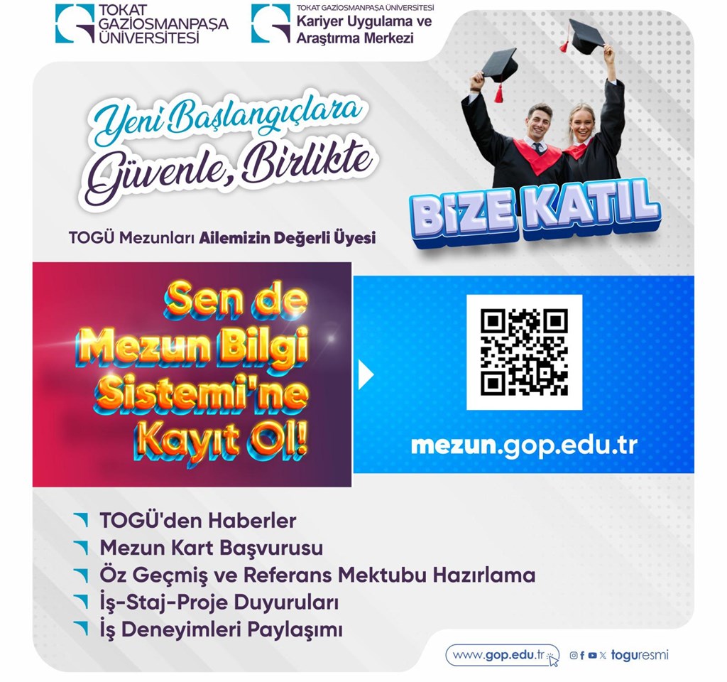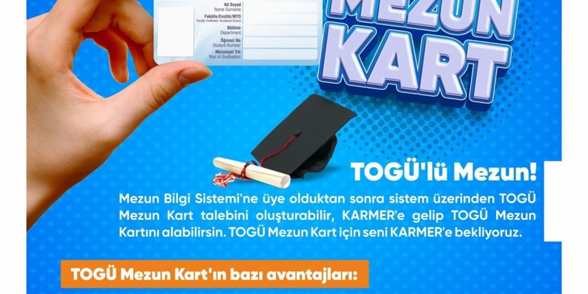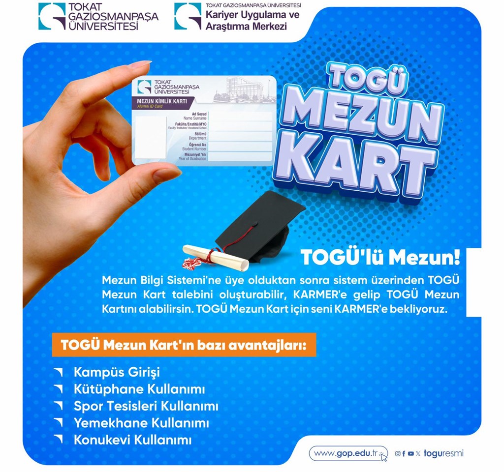 Üniversitemiz Kariyer Uygulama ve Araştırma Merkezi (KARMER) bünyesinde yer alan Mezunlar Koordinatörlüğünün faaliyetleri arasında Mezun Bilgi Sistemi ve TOGÜ Mezun Kart da bulunuyor. Mezun Bilgi Sistemi üyesi mezunlarımız öz geçmiş ve referans mektubu hazırlayabiliyor, iş, staj ve proje duyurularını görebiliyor, iş deneyimlerini paylaşabiliyor.