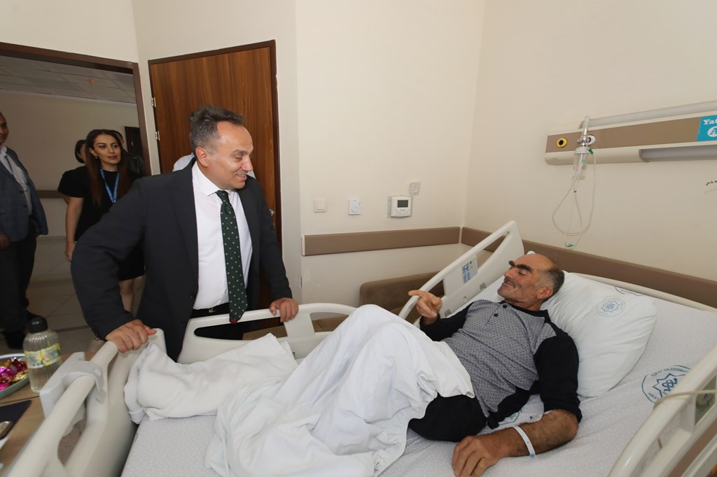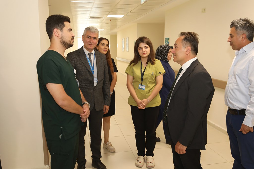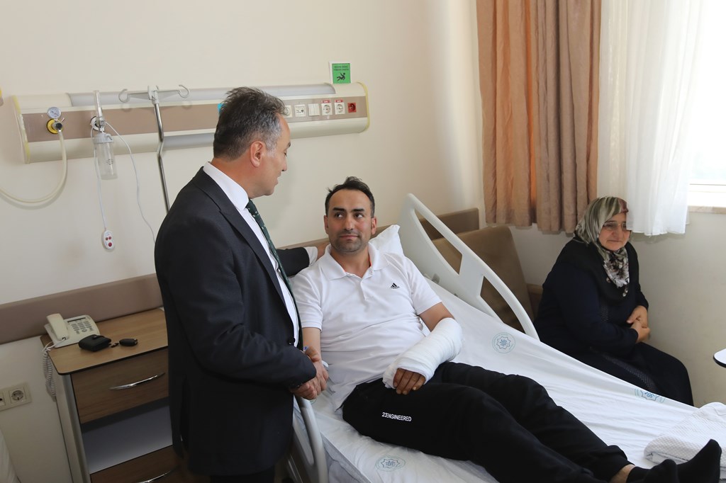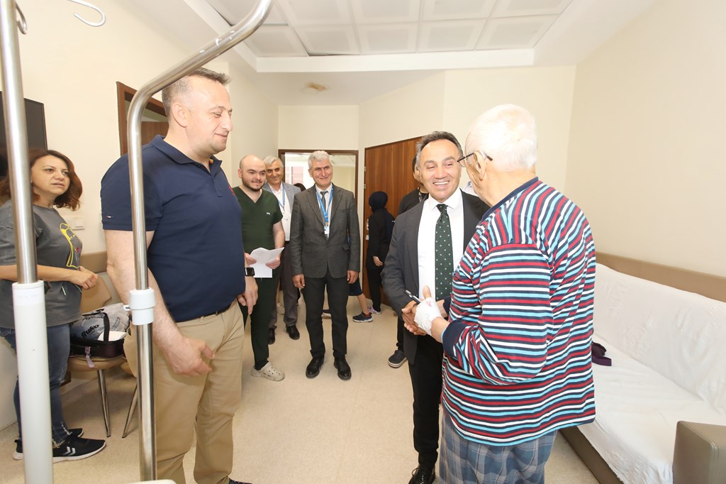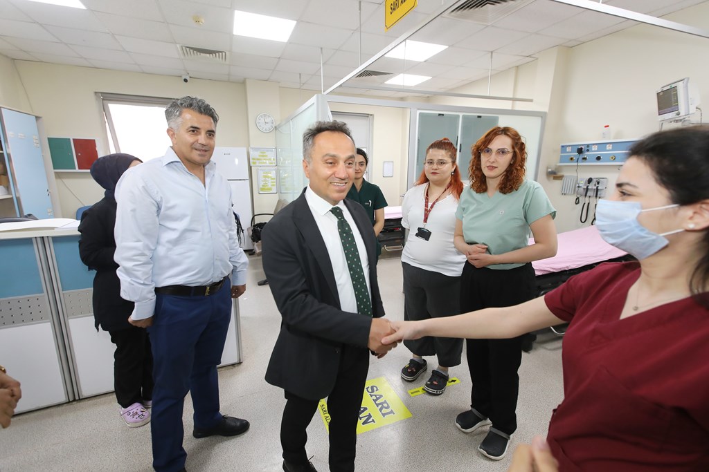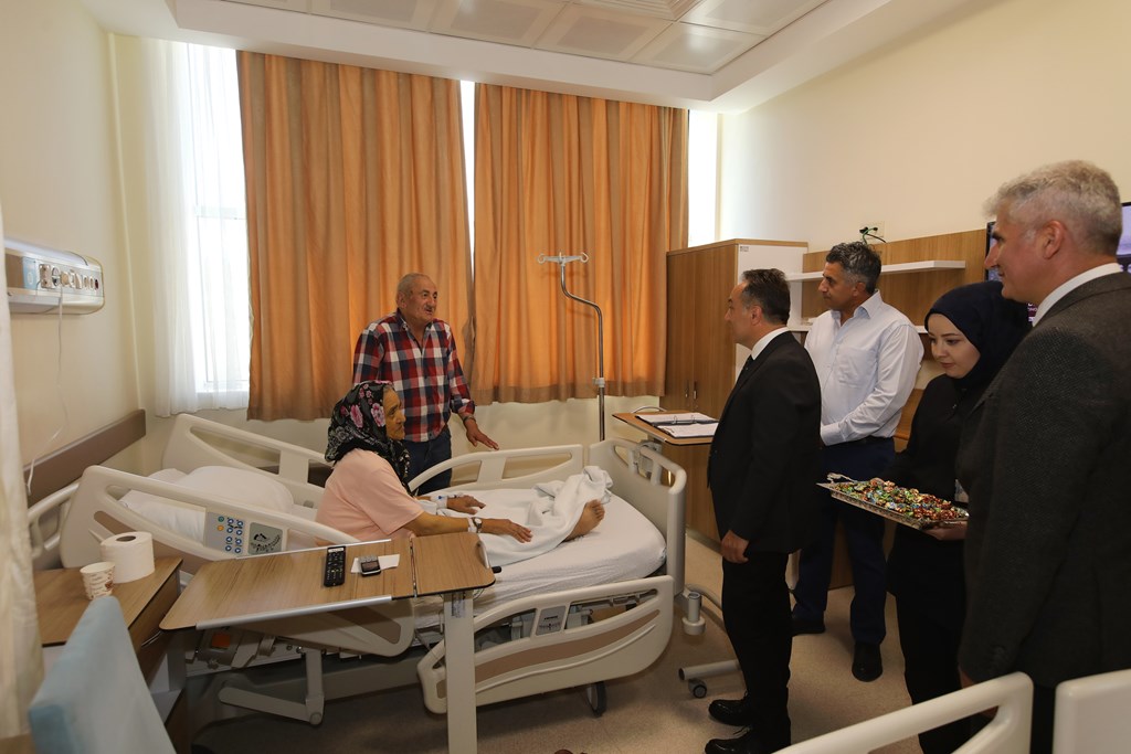 Rektörümüz Prof. Dr. Fatih YILMAZ, Hastanemiz Başhekim Yardımcısı Dr. Öğr. Üyesi Kenan YALÇIN, Hastanemiz Baş Müdürü Seyfullah ALPAY, Hemşirelik Hizmetleri Koordinatör Yardımcısı Serpil AZNİK Üniversite Hastanemizde Kurban Bayramının ilk gününde hasta, hasta yakınları ve personelimizle bayramlaştı. Rektör YILMAZ hastalara ve hasta yakınlarına şifa dileklerinde bulunarak Kurban Bayramı'nı kutlarken, hasta ve yakınlarından hastanemizdeki hizmetlerden ne kadar memnun olduklarını, taleplerinin neler olduğunu dinledi. Hasta yakınları verilen hizmetten son derece memnun olduklarını belirterek başta Rektörümüz olmak üzere tüm hastane çalışanlarına teşekkür ettiler. Rektörümüz de hasta ve hasta yakınlarına geçmiş olsun dileklerinde bulunarak daha iyi hizmet vermek için çalışmalara devam edeceklerini ifade etti. Rektörümüz Prof. Dr. Fatih YILMAZ Kurban Bayramında görev yapan personelimize de teşekkür ederek çalışmalarında kolaylıklar diledi.