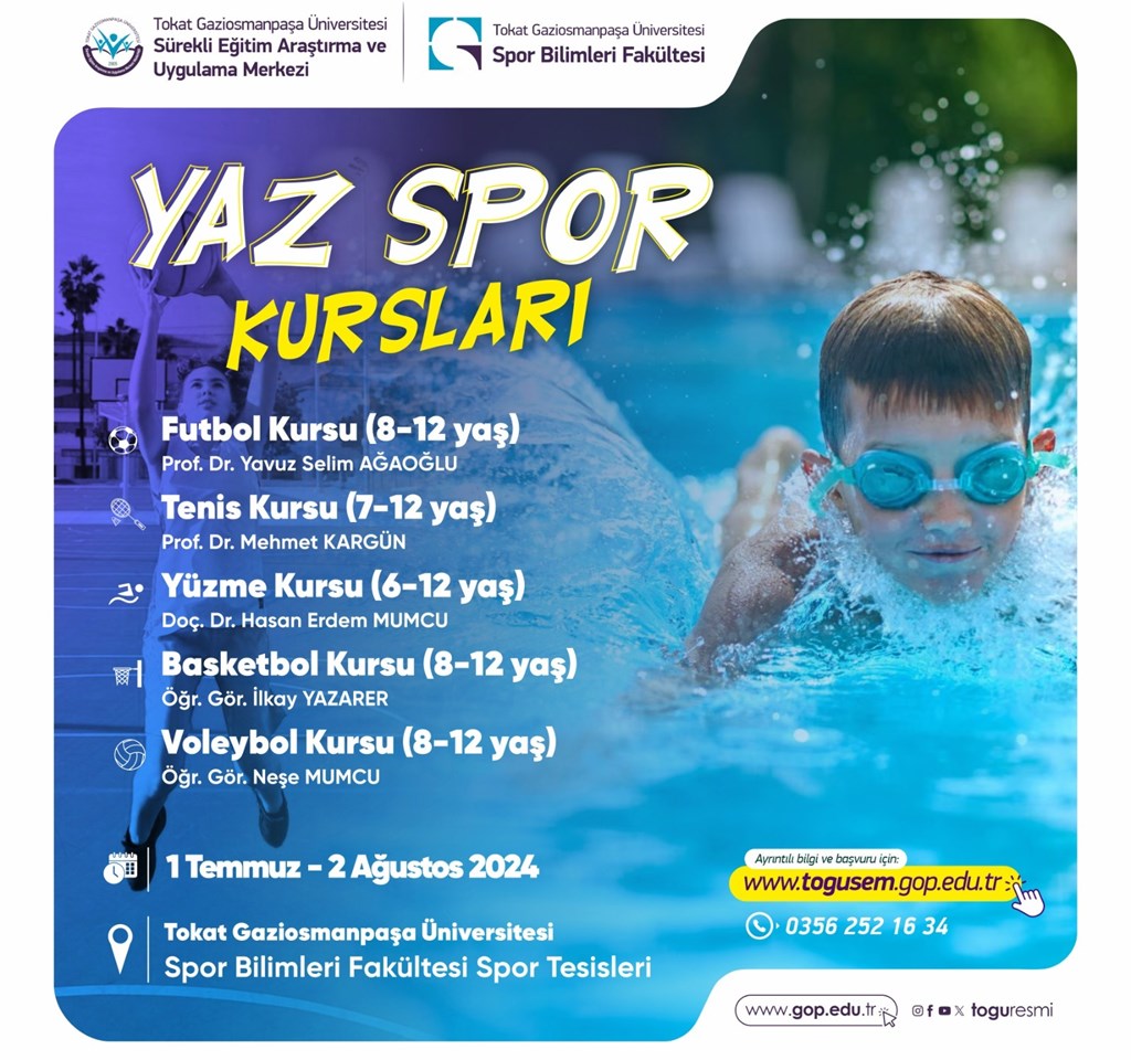 Spor Bilimleri Fakültesi ile TOGÜSEM tarafından düzenlenen yaz spor kursları 1 Temmuz-2 Ağustos 2024 tarihleri arasında gerçekleştirilecek. Spor Bilimleri Fakültesi Spor Tesislerinde düzenlenecek olan kurslar tüm halkımıza açık olacak. Bu kapsamda düzenlenen; futbol kursu (8-12 yaş), tenis kursu (7-12 yaş), yüzme kursu (6-12 yaş), basketbol kursu (8-12 yaş) ve voleybol kursu (8-12 yaş) için kayıtlar başladı.