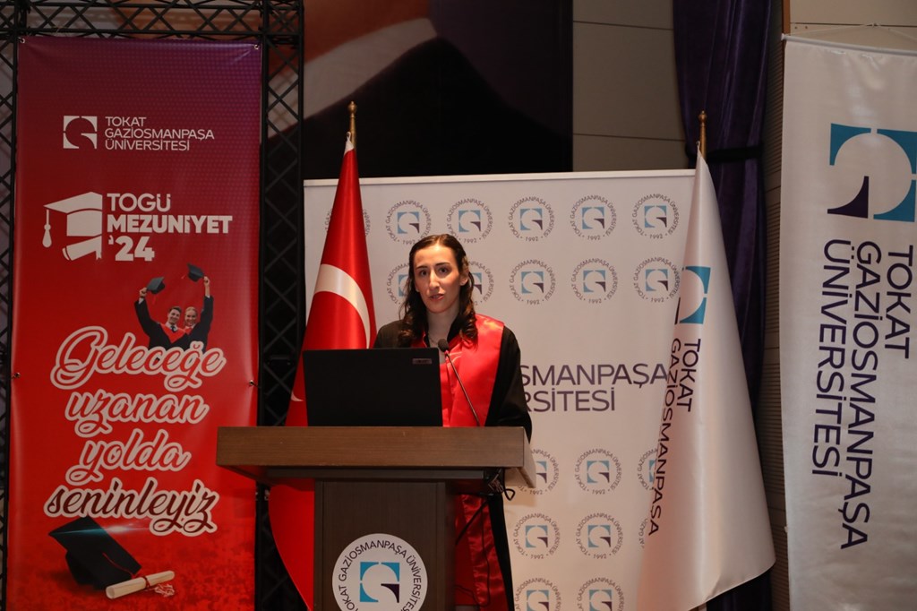 Tıp Fakültesi Birincisi Dr. Yaren GÖKÇEK yapmış olduğu konuşmada, eğitim öğretim sürecinden bahsetti. Eğitimi süresince hekimliğin meslekten öte sanat olduğunu ifade eden GÖKÇEK, doktorluğun kendilerine kutsal bir sorumluluk yüklediğini söyledi. Konuşmasının devamında kendilerini sürekli geliştireceklerini söyleyen GÖKÇEK, katkılarından dolayı hocalarına ve ailesine teşekkür ederek konuşmasını sonlandırdı.