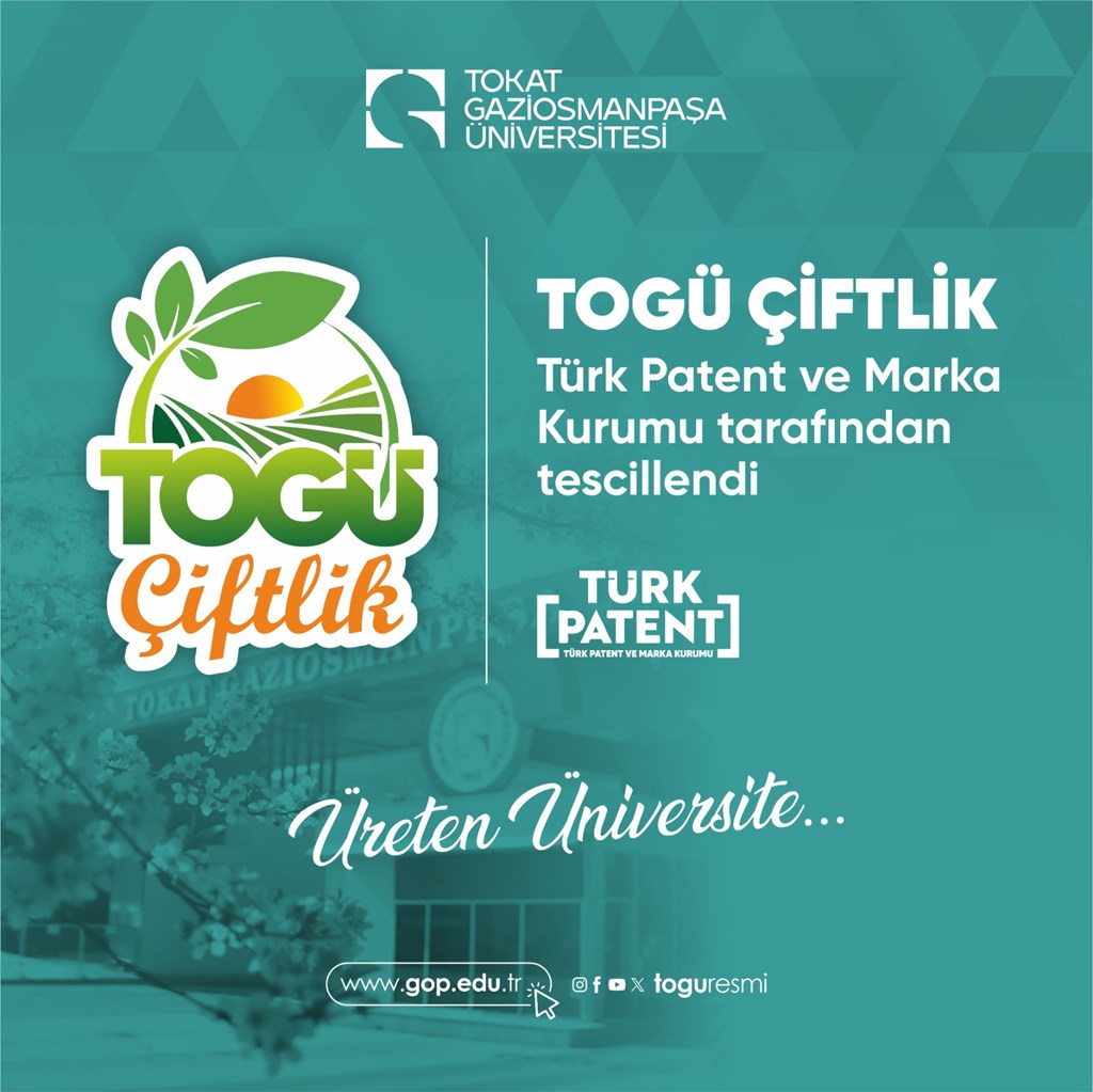 Üniversitemiz Tarımsal Uygulama ve Araştırma Merkezi tarafından Türk Patent ve Marka Kurumuna TOGÜ Çiftlik adıyla marka başvurusunda bulunuldu. Yapılan başvuru sonucunda mal ve hizmet sınıflarındaki ürünler TOGÜ Çiftlik markası ve logosuyla Türk Patent ve Marka Kurumu tarafından tescillendi.