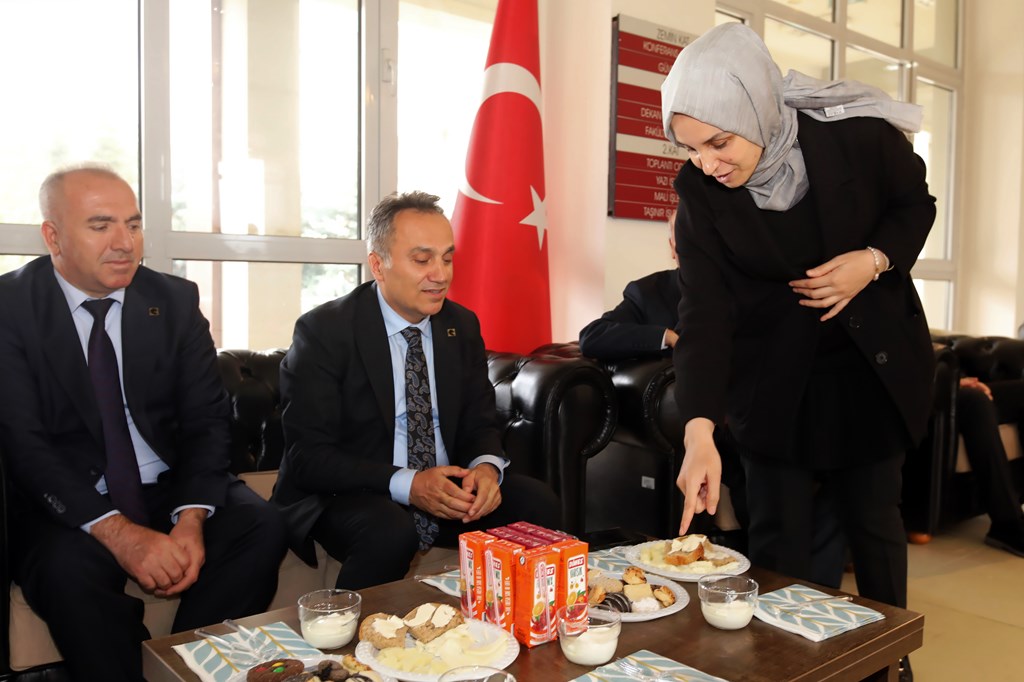 Ziyaret kapsamında; kaşar peyniri, tel peynir ve yoğurt gibi ürünlerin örneklerinin tadına bakan Rektörümüz Prof. Dr. Fatih Yılmaz’a, ürünlerin üretim süreci ve içerikleri hakkında da detaylı bilgi verildi.