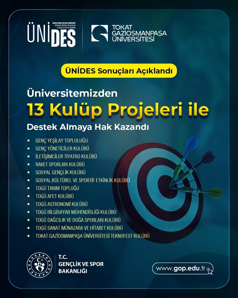 Gençlik ve Spor Bakanlığı’na bağlı Gençlik Hizmetleri Genel Müdürlüğü tarafından yürütülen Üniversite Öğrenci Toplulukları İş Birliği ve Destek Programı’nın (ÜNİDES) 4. Dönem başvuru sonuçları açıklandı. Bu kapsamda, üniversitemizden 13 proje kabul edilerek önemli bir başarıya imza atıldı.