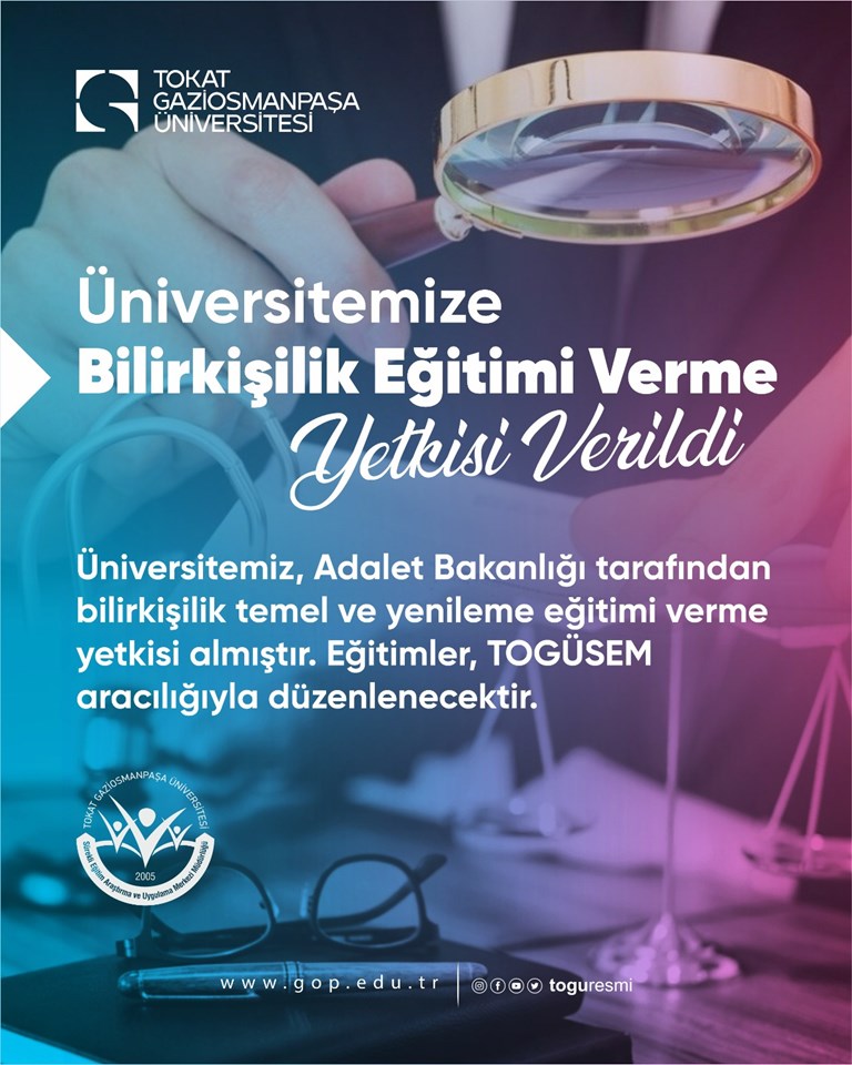 Bu yetki kapsamında, bilirkişilik alanında verilecek temel ve yenileme eğitimleri, üniversitemiz bünyesinde faaliyet gösteren Tokat Gaziosmanpaşa Üniversitesi Sürekli Eğitim Uygulama ve Araştırma Merkezi (TOGÜSEM) aracılığıyla gerçekleştirilecek.