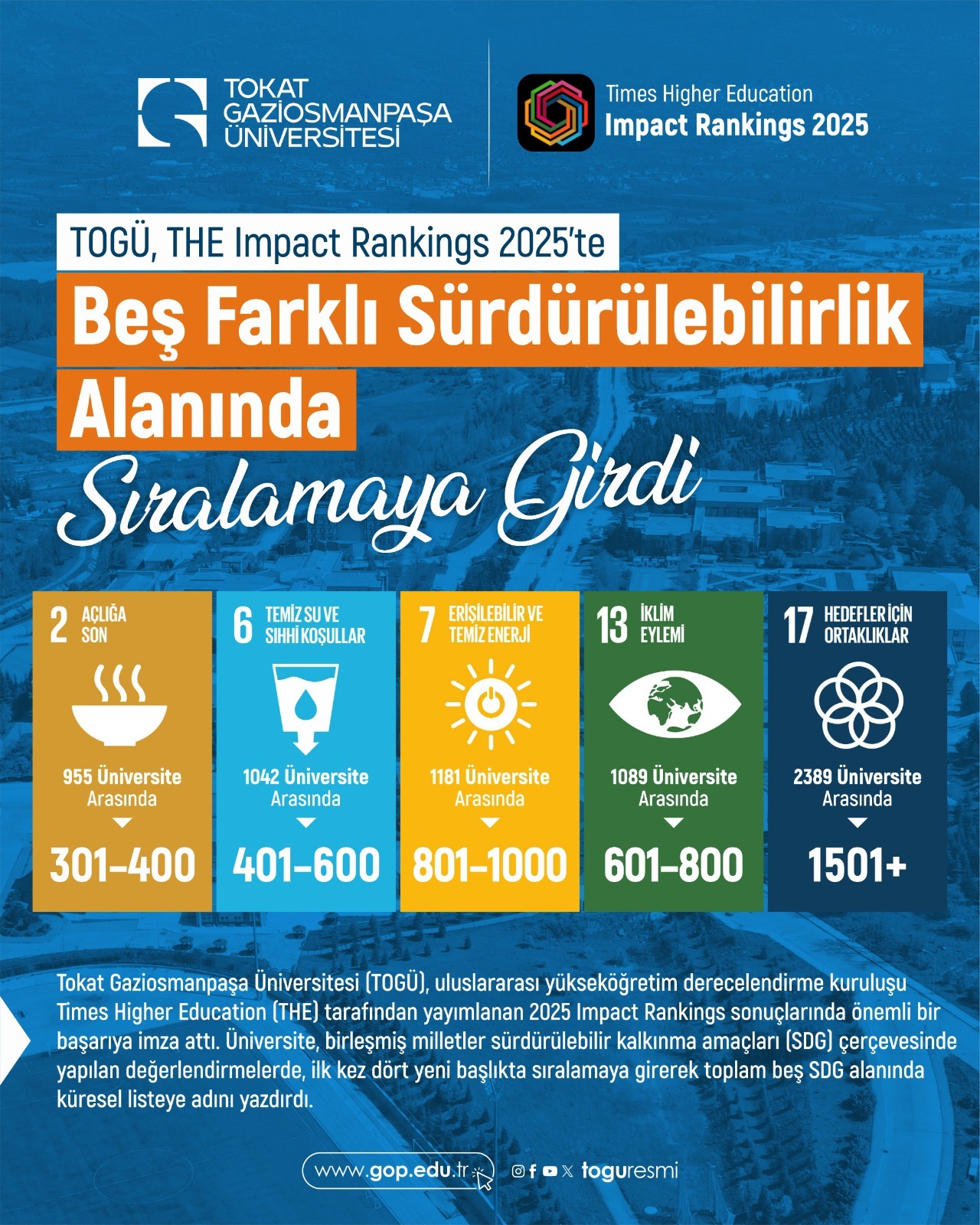 Bu başarıyla birlikte Tokat Gaziosmanpaşa Üniversitesi, dünya genelindeki üniversiteler arasında sürdürülebilirlik alanında adından daha fazla söz ettirmeye başlamış, eğitim ve araştırma faaliyetlerini uluslararası standartlara uygun bir şekilde yürüttüğünü bir kez daha kanıtlamış oldu.