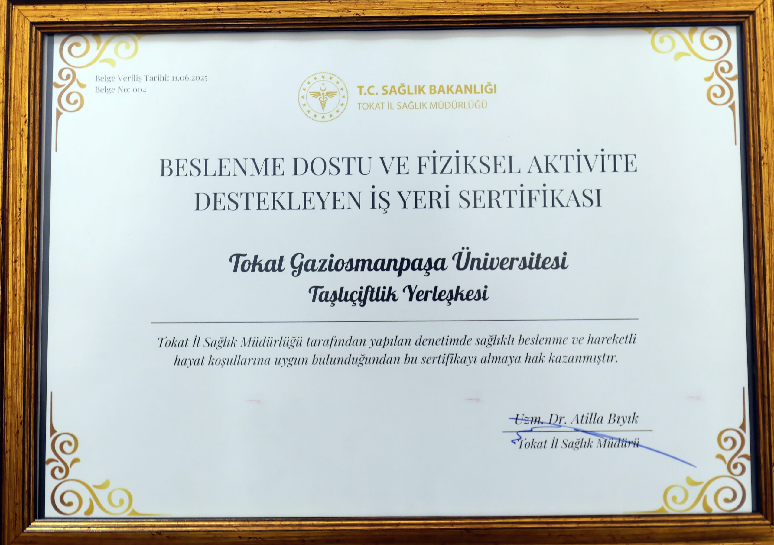 İl Sağlık Müdürlüğü denetim ekibi tarafından yapılan incelemeler sonrasında kriterleri başarıyla karşılayan Üniversitemize verilen sertifika, Tokat İl Sağlık Müdürü Uzm. Dr. Atilla Bıyık tarafından Rektörümüz Prof. Dr. Fatih Yılmaz’a takdim edildi. Rektörlük makamında gerçekleşen törende, Üniversitemizin bu konudaki öncü yaklaşımına vurgu yapıldı.