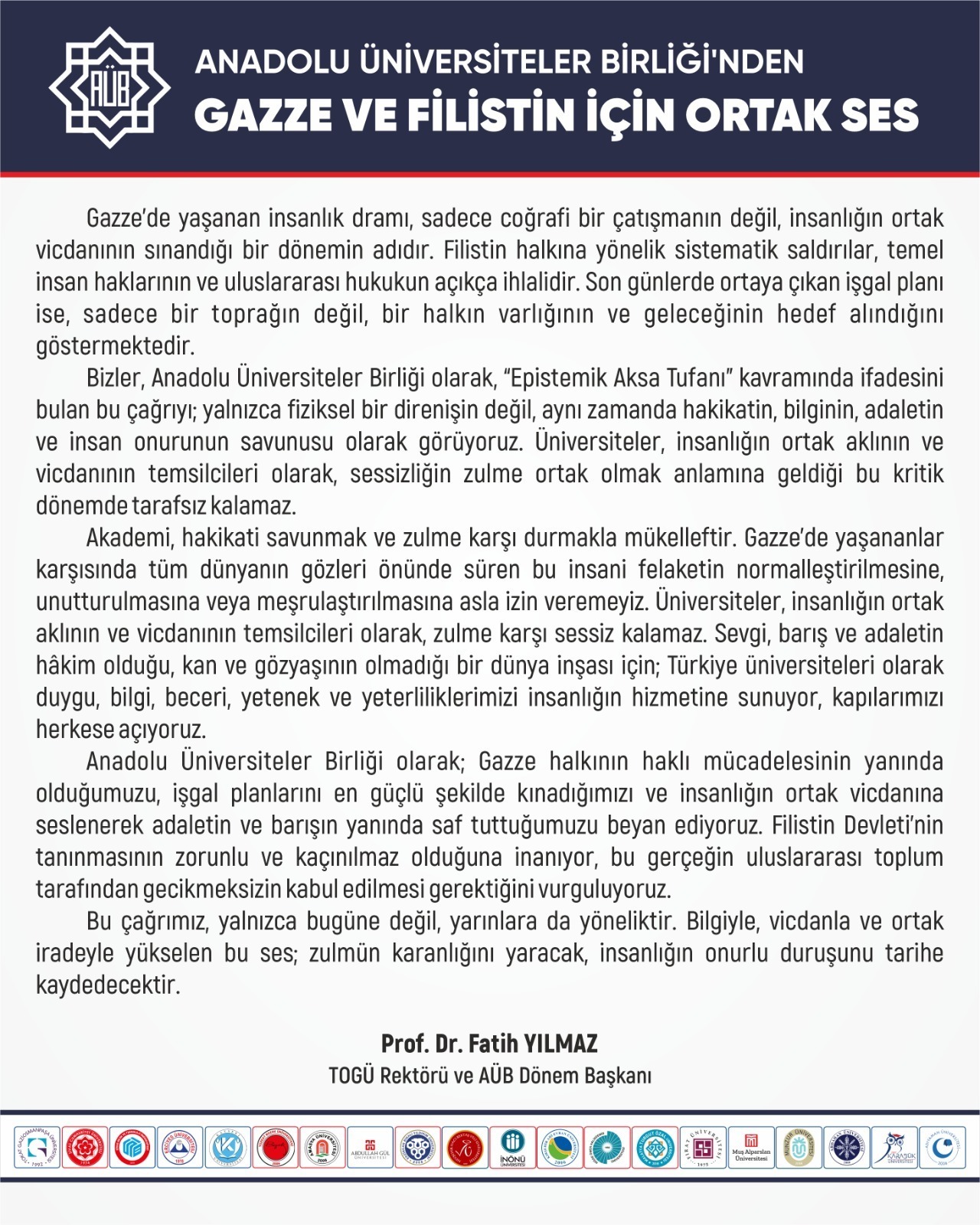 Anadolu Üniversiteler Birliği olarak; Gazze halkının haklı mücadelesinin yanında olduğumuzu, işgal planlarını en güçlü şekilde kınadığımızı ve insanlığın ortak vicdanına seslenerek adaletin ve barışın yanında saf tuttuğumuzu beyan ediyoruz. Filistin Devleti’nin tanınmasının zorunlu ve kaçınılmaz olduğuna inanıyor, bu gerçeğin uluslararası toplum tarafından gecikmeksizin kabul edilmesi gerektiğini vurguluyoruz.