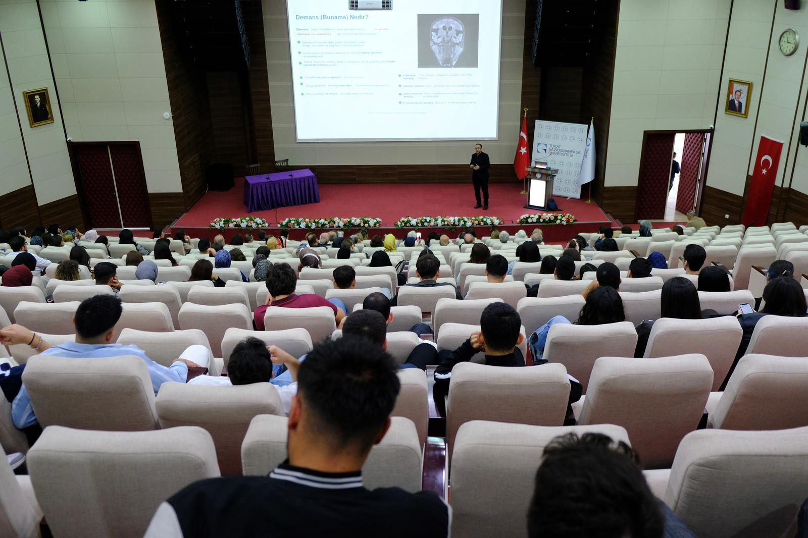 Konferansta, TOGÜ Tıp Fakültesi Nöroloji Anabilim Dalı öğretim üyesi Dr. Öğr. Üyesi Yusuf Koçak konuşmacı olarak yer aldı. Koçak, unutkanlığın her zaman yaşlanmanın doğal bir sonucu olmadığına dikkat çekerek Alzheimer hastalığı ile yaşlılığa bağlı unutkanlık arasındaki farkları anlattı. Katılımcılara bilimsel veriler ışığında önemli bilgiler sunan Koçak, erken tanının önemine de vurgu yaptı. Alzheimer hastalığına dair doğru bilinen yanlışları aktardı.