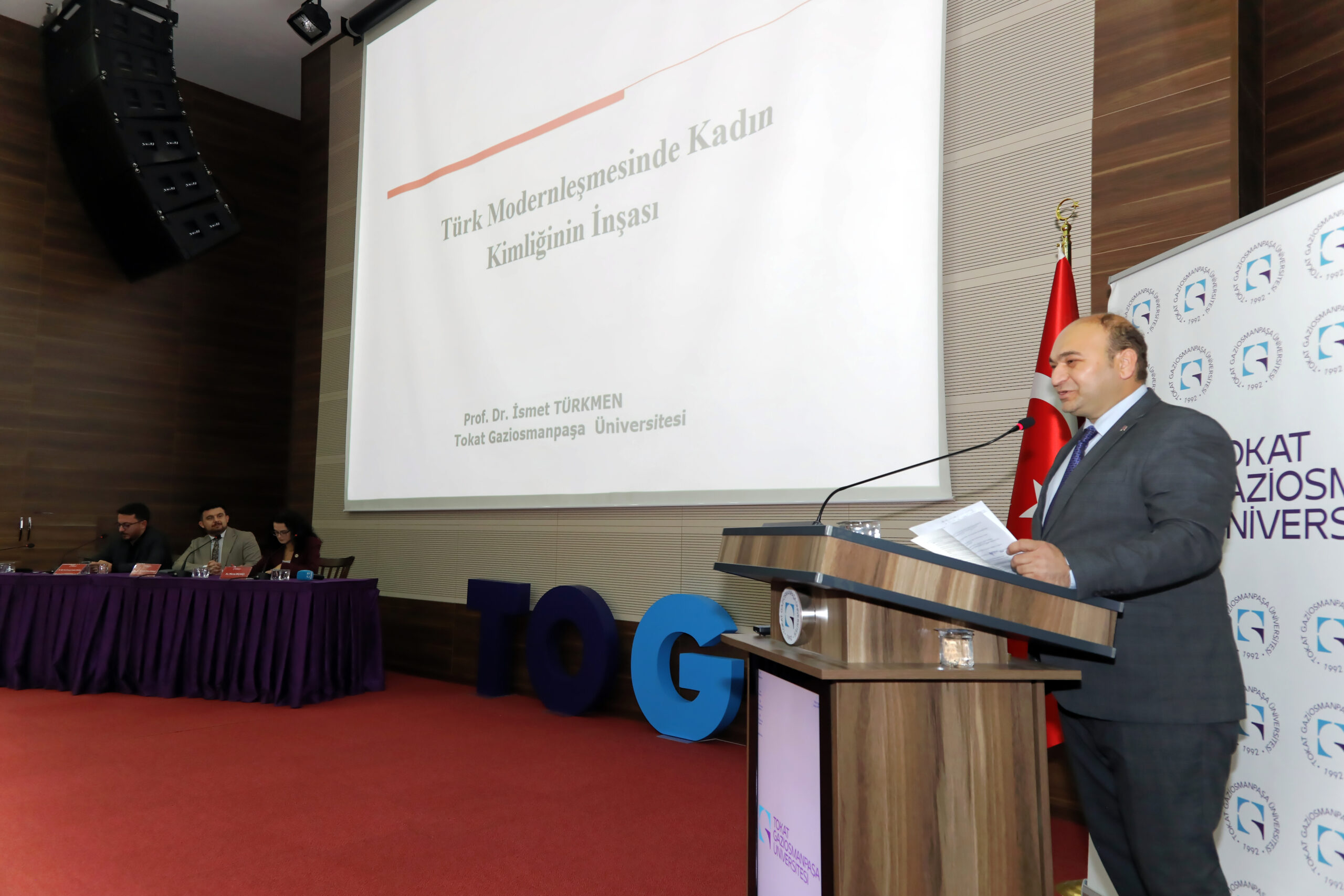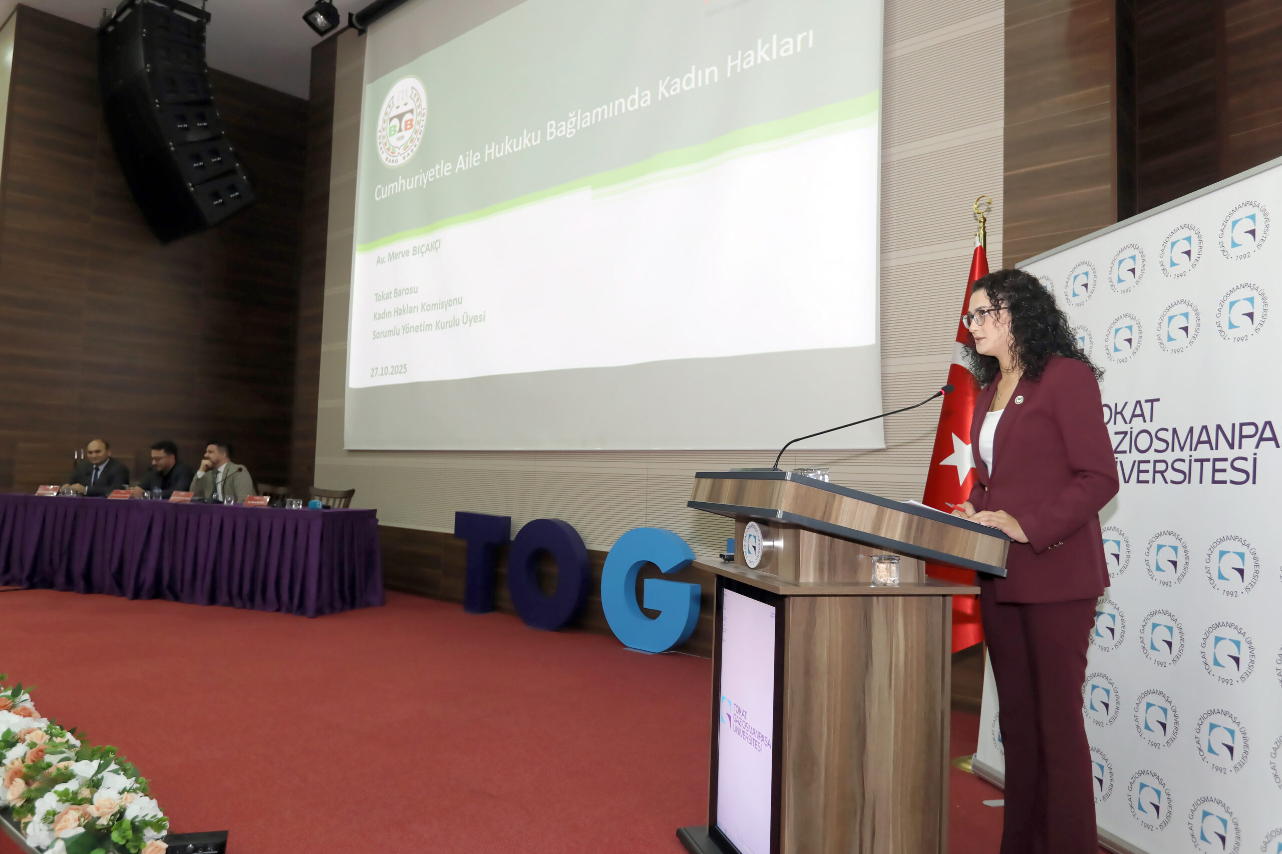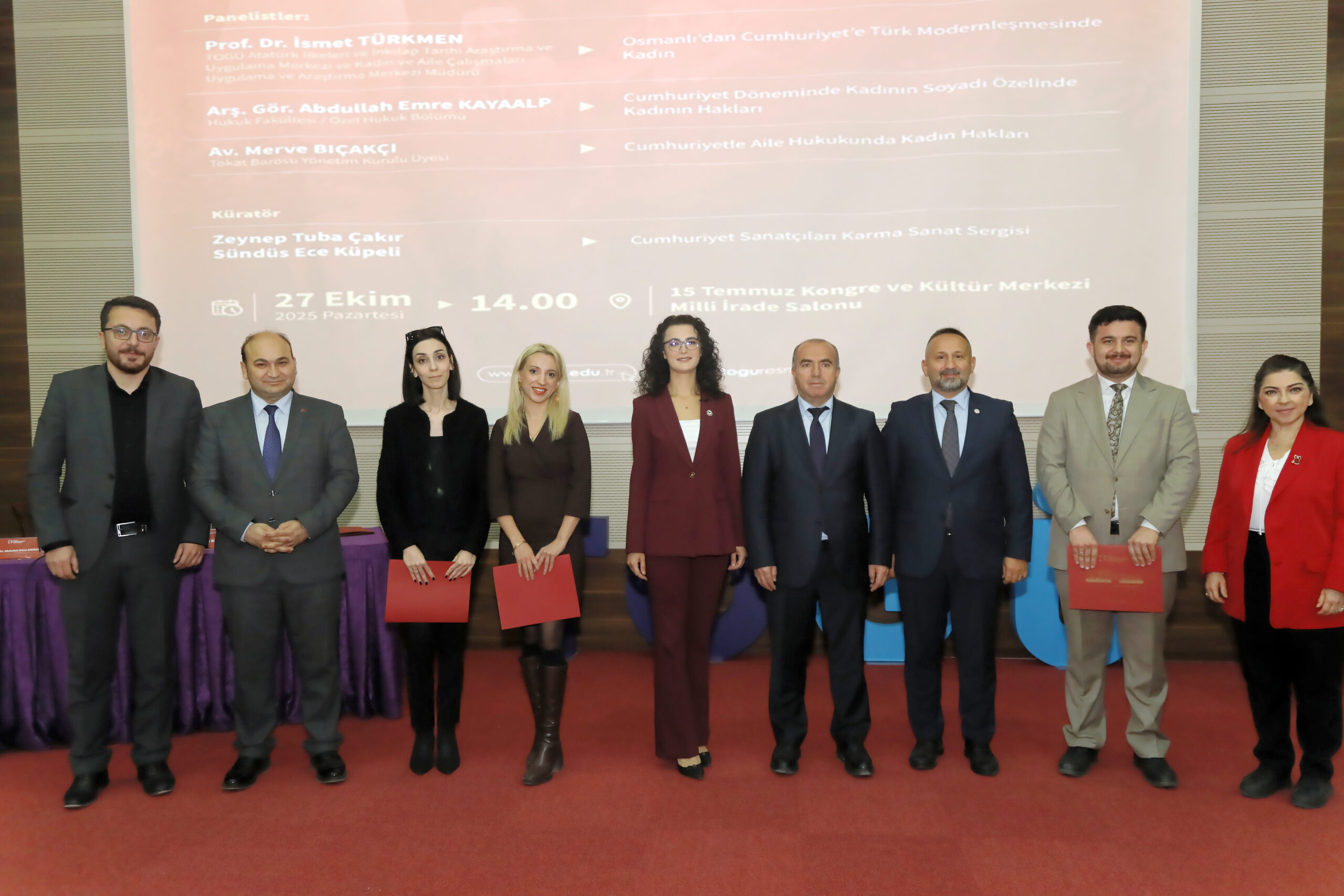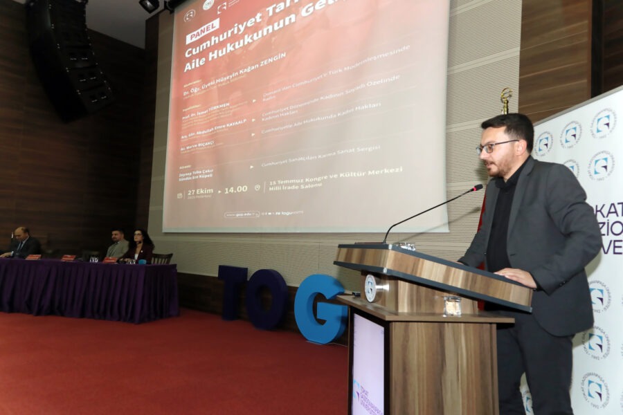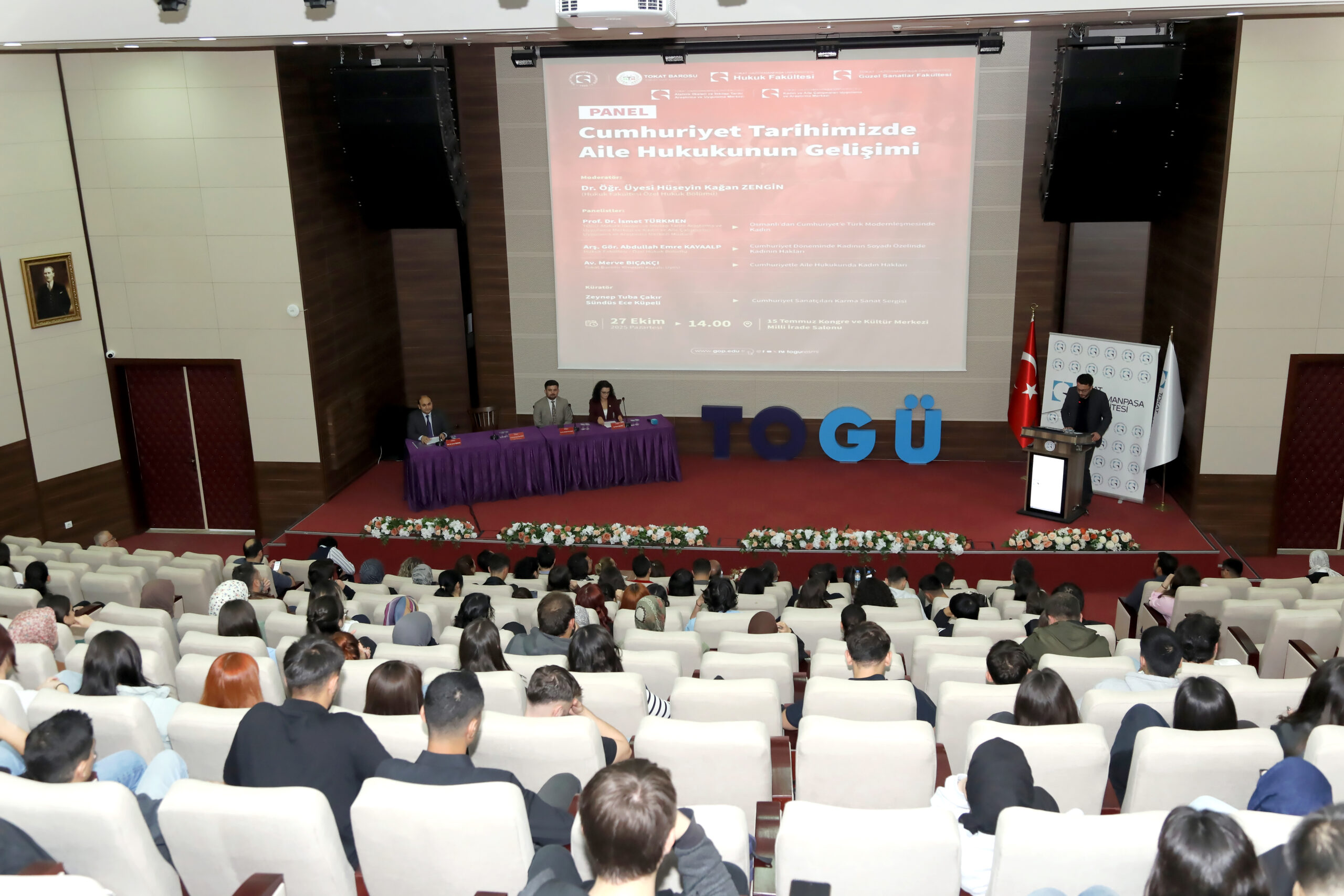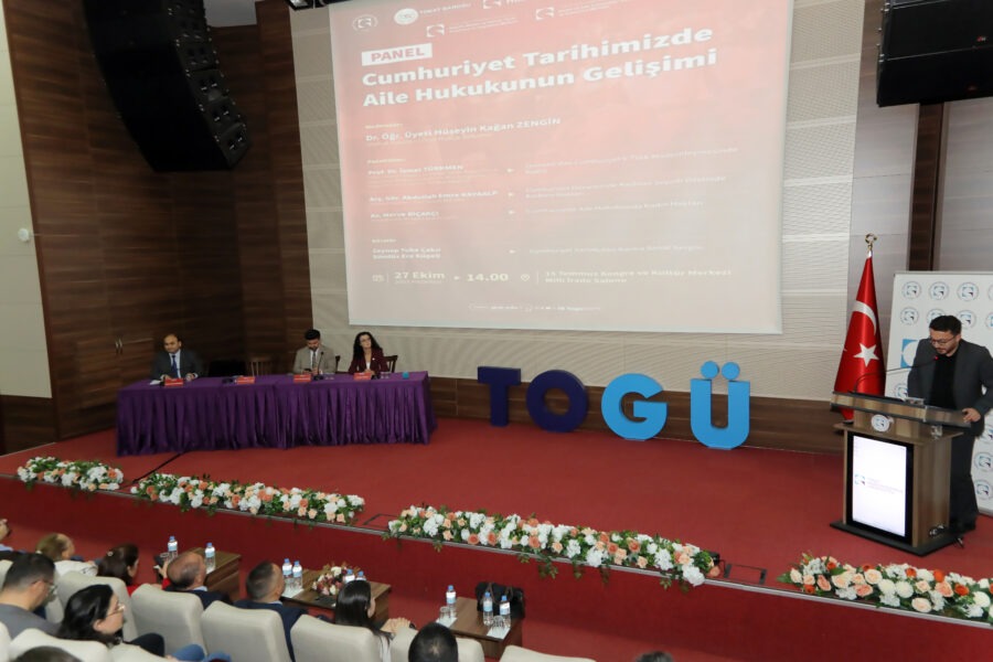 Üniversitemiz tarafından 29 Ekim Cumhuriyet Bayramı etkinlikleri kapsamında düzenlenen “Cumhuriyet Tarihimizde Aile Hukukunun Gelişimi” konulu panel, 15 Temmuz Kongre ve Kültür Merkezi Milli İrade Salonu’nda gerçekleştirildi. Tokat Barosu, TOGÜ Hukuk Fakültesi, TOGÜ Atatürk İlkeleri ve İnkılap Tarihi Uygulama ve Araştırma Merkezi, Kadın ve Aile Çalışmaları Uygulama ve Araştırma Merkezi ile Güzel Sanatlar Fakültesinin iş birliğinde düzenlenen etkinliğe Rektör Yardımcısı Prof. Dr. Yusuf Temür, Baro Başkanı Av. Volkan Bozkurt, dekanlar, akademisyenlerin, öğrencilerin ve hukuk camiasından temsilcilerin yoğun ilgisiyle takip edildi.