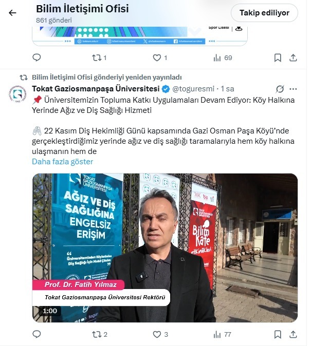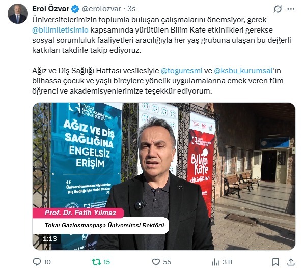 Yapılan etkinlik, YÖK Başkanı Prof. Dr. Erol Özvar tarafından hem kişisel sosyal medya hesaplarında hem de YÖK Bilim İletişimi Ofisi hesaplarında paylaşılarak geniş kitlelere duyuruldu. Prof. Dr. Özvar açıklamasında, üniversitelerin toplumla buluşan çalışmalarını önemsediklerini vurgulayarak, “Gerek bilim iletişimi kapsamında yürütülen Bilim Kafe etkinlikleri gerekse sosyal sorumluluk faaliyetleriyle her yaş grubuna ulaşan bu değerli katkıları takdirle takip ediyoruz” ifadelerini kullandı. Ağız ve Diş Sağlığı Haftası dolayısıyla gerçekleştirilen bu anlamlı çalışma için Üniversitemize teşekkür ederek, toplum odaklı projelerin önemine dikkat çekti.