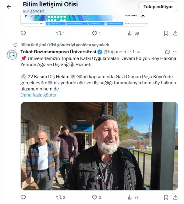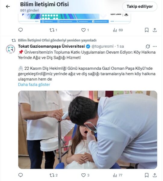 22 Kasım Diş Hekimliği Günü kapsamında Üniversitemiz Diş Hekimliği Fakültesi ile TOGÜ Toplumsal Katkı ve Sosyal İnovasyon Koordinatörlüğü tarafından Gazi Osman Paşa Köyü’nde kapsamlı bir diş taraması etkinliği düzenlendi.